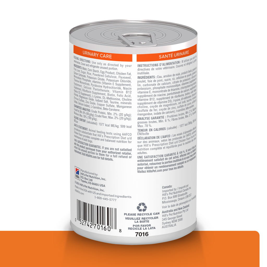 Hills u/d Urinary Care 13 onz es una comida húmeda especializada para el cuidado urinario de perros adultos. Ayuda a prevenir problemas urinarios con ingredientes cuidadosamente seleccionados.