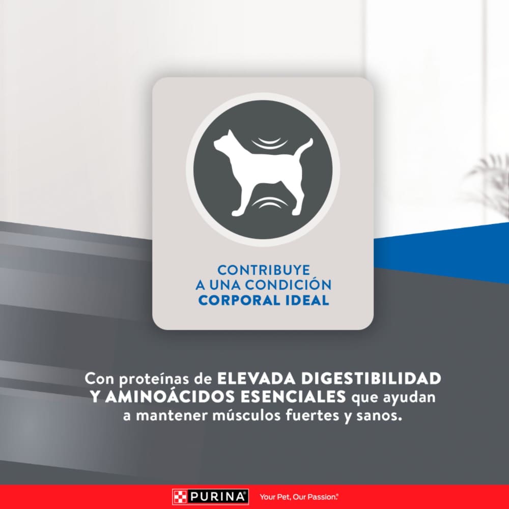 CONDICIÓN CORPORAL IDEAL La utilización de fuentes de proteínas de elevada digestibilidad garantiza el aporte de aminoácidos esenciales que ayudan a mantener músculos fuertes y sanos. Así, cualquiera sea el nivel de actividad física de tu gato, puedes estar seguro de que sus necesidades proteicas estarán satisfechas.