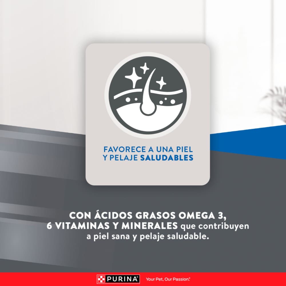 PIEL SANA Y PELAJE BRILLANTE La combinación de los ácidos grasos Omega 6 y 3 junto a vitaminas y minerales favorecen la salud de la piel y un pelaje brillante, primera señal de una salud general adecuada.