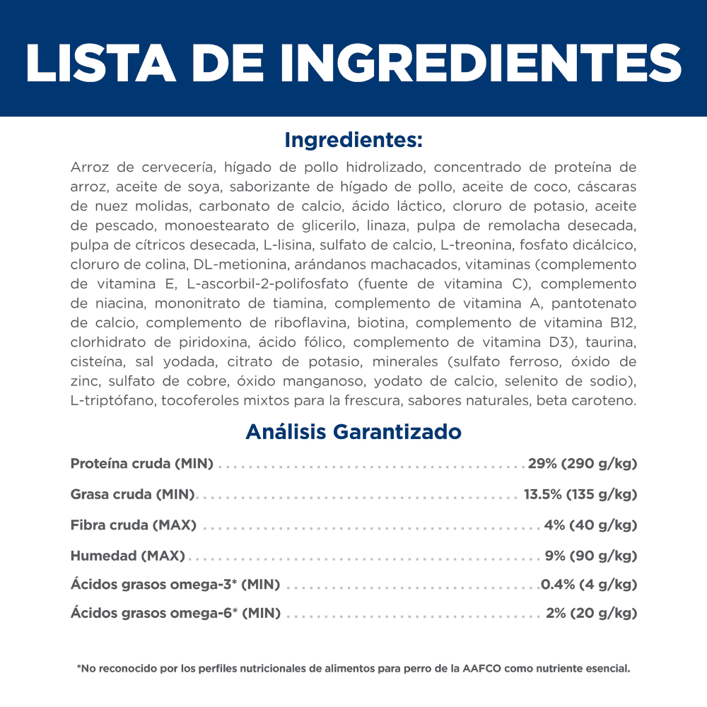 Arroz de cervecería, hígado de pollo hidrolizado, celulosa en polvo, aceite de soya, saborizante de hígado de pollo, ácido láctico, carbonato de calcio, sulfato de calcio, L-lisina, monoestearato de glicerilo, cloruro de potasio, DL-metionina, L-treonina, cloruro de colina, taurina, vitaminas (complemento de vitamina E, L-ascorbil-2-polifosfato (fuente de vitamina C), complemento de niacina, mononitrato de tiamina, pantotenato de calcio, complemento de vitamina A, clorhidrato de piridoxina, biotina, complemento de riboflavina, complemento de vitamina B12, ácido fólico, complemento de vitamina D3), citrato de potasio, fosfato dicálcico, minerales (sulfato ferroso, óxido de zinc, sulfato de cobre, óxido manganoso, yodato de calcio, selenito de sodio), tocoferoles mixtos para la frescura, sabores naturales, L-triptófano, beta caroteno.