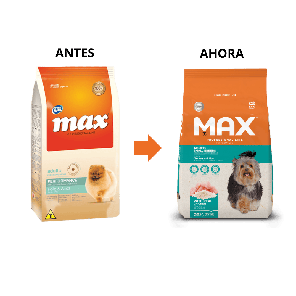 Max Professional Line es un alimento Premium Especial, producido sin adición de colorantes y aromatizantes artificiales para tu compañero. Especies: Caninos. Presentación: 2Kg, 8Kg Max Performance Adultos Razas Pequeñas Pollo & Arroz, le ofreces proteínas de alta calidad y digestibilidad, y antioxidantes naturales que ayudan a mantener sanas las defensas del organismo y refuerzan la vitalidad del perro adulto. Producido con ingredientes seleccionados, como linaza - fuente de omega 3 - y arroz - excelente fuente de carbohidratos. También cuenta con Extracto de Yucca, que proporciona menor volumen y olor de las heces, y prebióticos, para mejorar la absorción de los nutrientes. Composición Básica