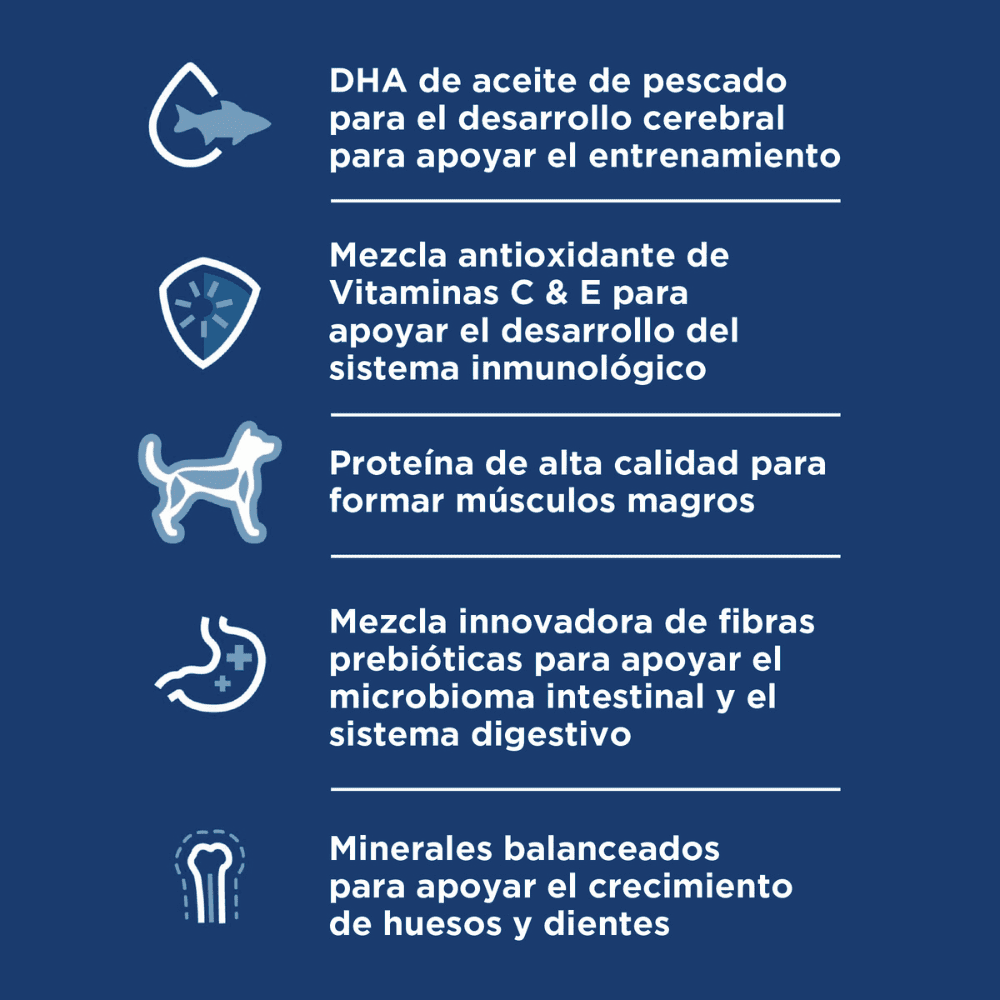 Este alimento esta formulado con nutrientes vitales que respaldan 5 componentes esenciales: inmunidad fuerte, desarrollo óseo y muscular, integridad digestiva, piel y pelaje hermosos, y desarrollo cognitivo y de la visión. Con este alimento, tu cachorro de raza pequeña y miniatura tendrá el mejor comienzo en la vida, permitiéndole crecer a su máximo potencial.