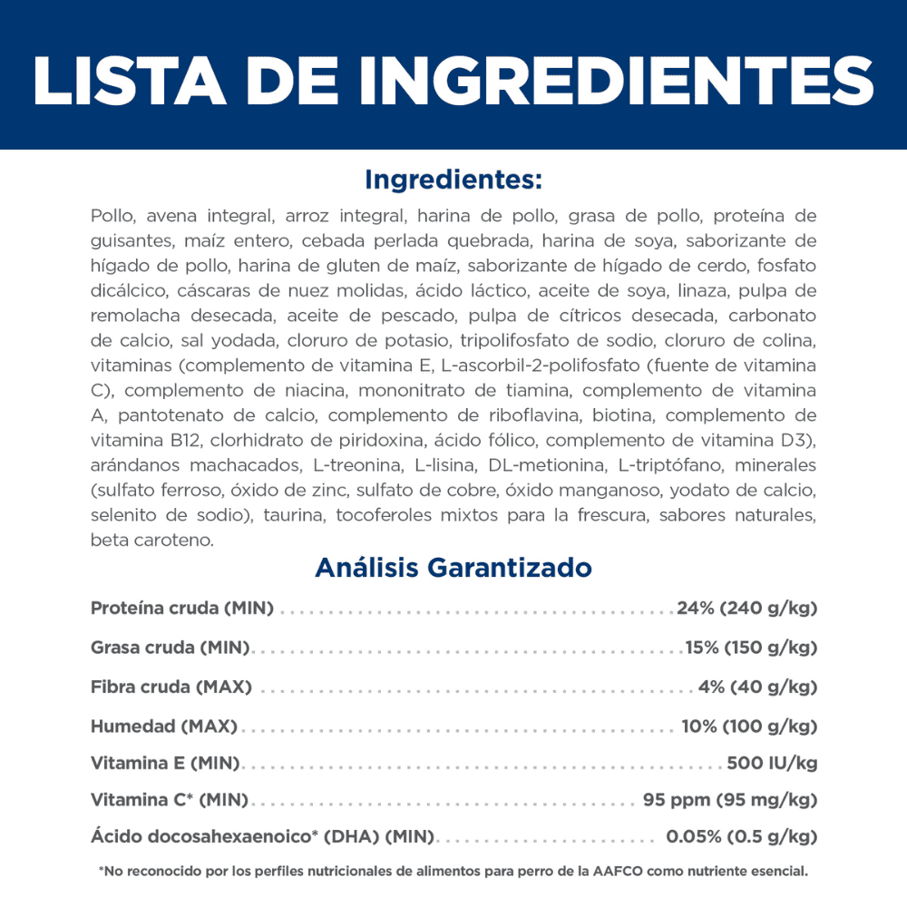 Harina de pollo (carne, piel), trigo entero, sorgo entero, grasa de pollo, maíz entero, harina de gluten de maíz, cebada perlada quebrada, arroz integral, saborizante de hígado de pollo, pulpa de remolacha desecada, sabor a cerdo, linaza, aceite de pescado, fosfato dicálcico, ácido láctico, aceite de soya, cloruro de potasio, sal yodada, l-lisina, vitaminas (complemento de vitamina e, l-ascorbil-2-polifosfato (fuente de vitamina c), complemento de niacina, mononitrato de tiamina, complemento de vitamina a, pantotenato de calcio, complemento de riboflavina, complemento de vitamina b12, clorhidrato de piridoxina, biotina, ácido fólico, complemento de vitamina d3), cloruro de colina, l-treonina, minerales (sulfato ferroso, óxido de zinc, sulfato de cobre, óxido manganoso, yodato de calcio, selenito de sodio), carbonato de calcio, taurina, tocoferoles mixtos para la frescura, sabores naturales (romero, té verde, menta verde), guisantes verdes, manzanas, arándanos, zanahorias, beta caroteno, brócoli.