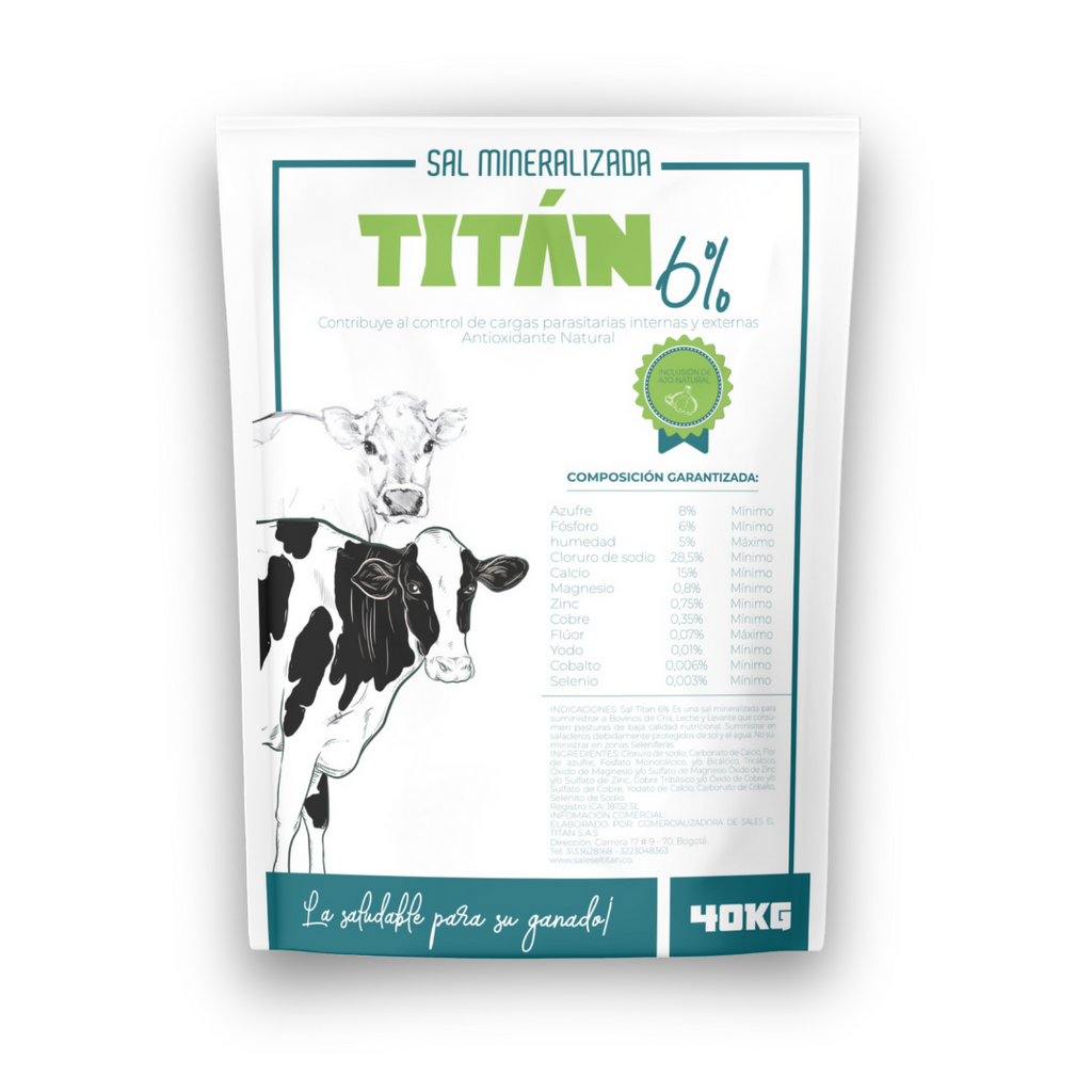 La Sal Mineralizada Titán 6% con Ajo está diseñada para bovinos de carne y leche que requieren un suplemento con mayor concentración de fósforo (6%), junto con minerales esenciales que favorecen la salud ósea, la reproducción y el rendimiento productivo. Su fórmula incluye ajo natural, reconocido por sus propiedades que ayudan a repeler parásitos externos e internos, mejorando el bienestar del hato.