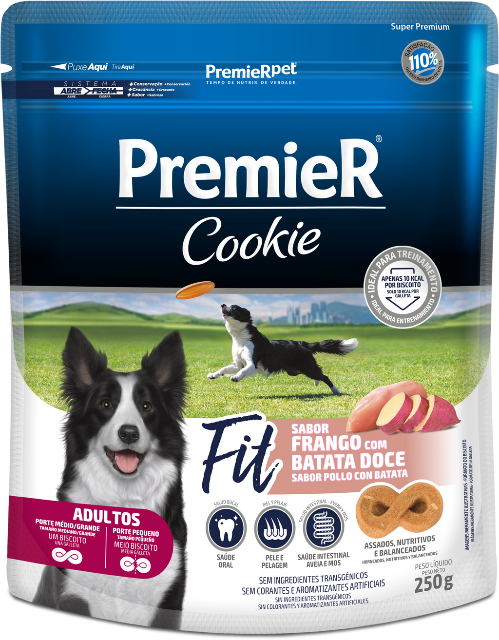Harina de trigo, harina de chicharrón de cerdo, harina de vísceras de pollo (4,5%), colágeno hidrolizado, huevo en polvo, almidón de maíz, copos de avena (1,5%), harina de batata (2%), fibra de trigo, puré de banana, arroz, grasa de cerdo, agar, antioxidantes (tocoferol y extracto de romero), biotina, carbonato de calcio, colorante natural (urucum), hexameta fosfato de sodio (0,1%), hidrolizado de hígado de cerdo, manano-oligosacáridos, quelato de aminoácido de zinc.