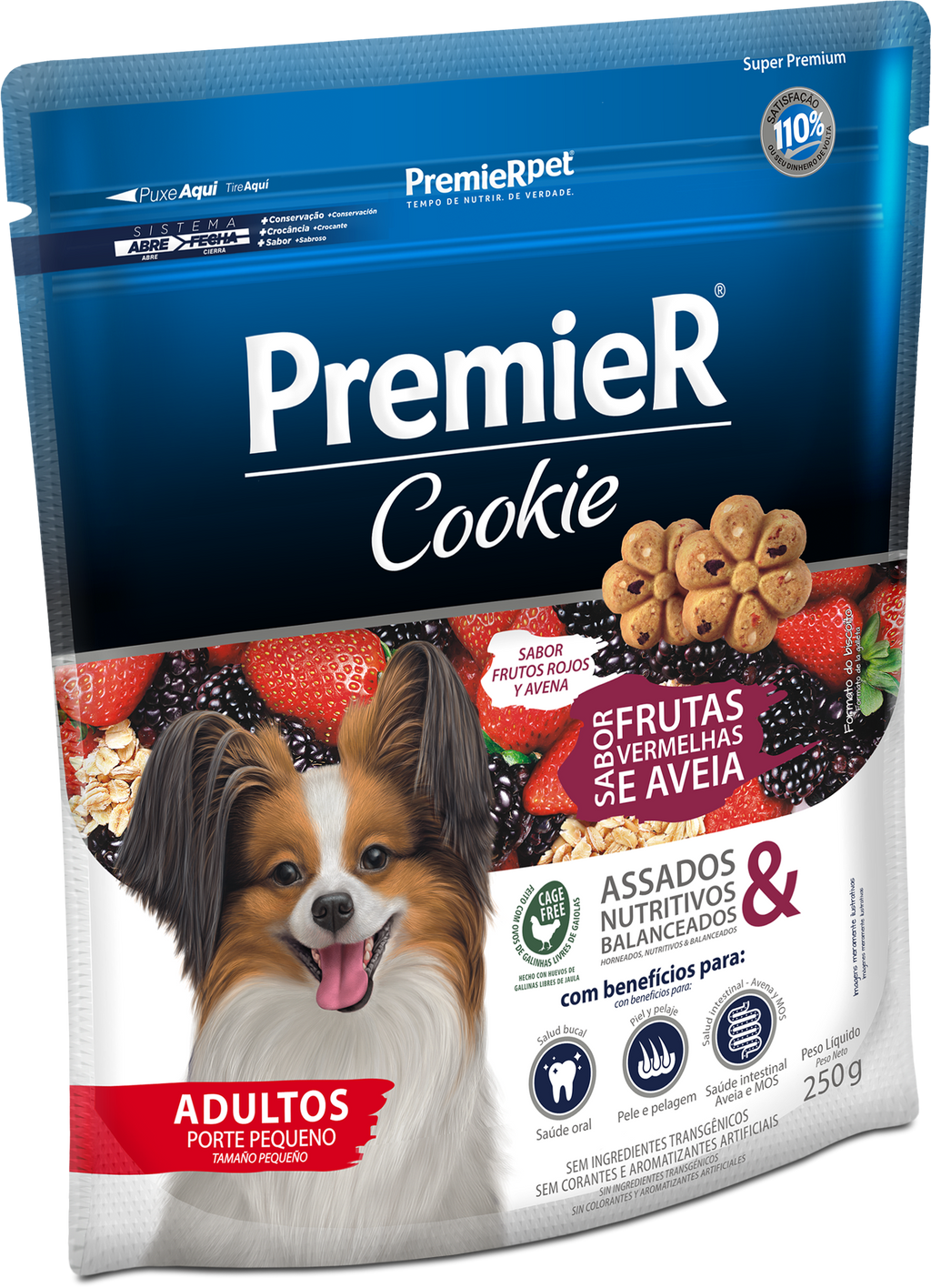 Harina de trigo, harina de chicharrón de cerdo, colágeno hidrolizado, huevo en polvo, almidón de maíz, copos de avena (5,0%), harina de arroz, fibra de trigo, frutos rojos deshidratados (fresa y mora (1,0%)), arroz, grasa de cerdo, ácido cítrico, agar, antioxidantes (tocoferol y extracto de romero), biotina, carbonato de calcio, colorantes naturales (carmín de cochinilla, remolacha, clorofila y urucum), goma xantana, hexametafosfato de sodio (0,1%), hidrolizado de hígado de cerdo, manano-oligosacáridos, quelato de aminoácido de zinc.