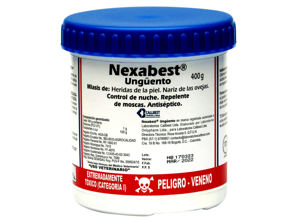 NEXABEST UNGÜENTO. Antiparasitario externo. Especies:  Bovinos, Equinos, Felinos, Ovinos, Porcinos. Presentación:  60 g | 220 g | 400 g. Uso terapéutico: ECTOPARASITICIDA Principio Activo: DICLORVOS Descripción: NEXABEST UNGÜENTO es un antiparasitario externo. Composición, contenido: